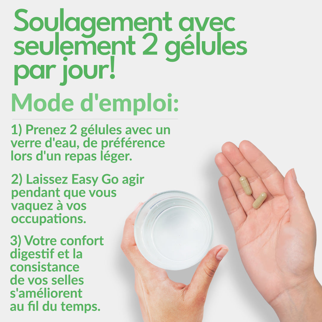 Prendi 2 capsule di Go Easy Go al giorno con un bicchiere d'acqua.