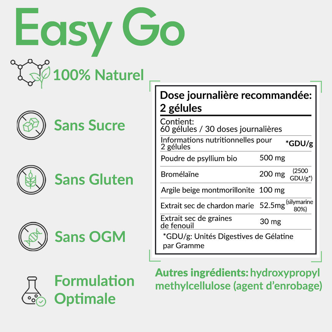 Si consiglia di assumere due capsule di Easy Go al giorno, preferibilmente durante un pasto o uno spuntino.