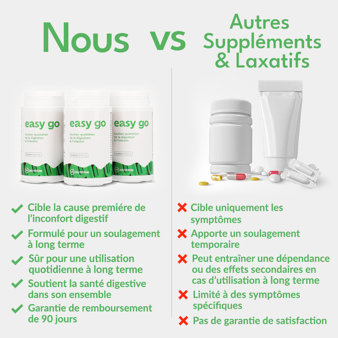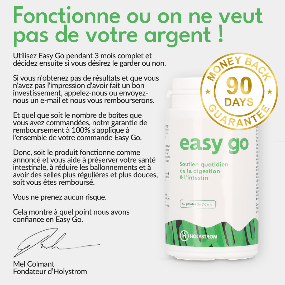 Nel caso improbabile in cui non fossi soddisfatto dei risultati ottenuti dopo aver utilizzato Easy Go come indicato per 90 giorni, contatta semplicemente il nostro servizio clienti telefonicamente al numero 09 70 70 50 81 o via e-mail all'indirizzo info@holystrom.come ti rimborseremo l'intero importo, anche se hai ordinato più scatole!